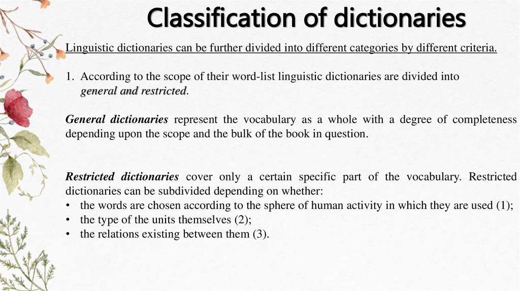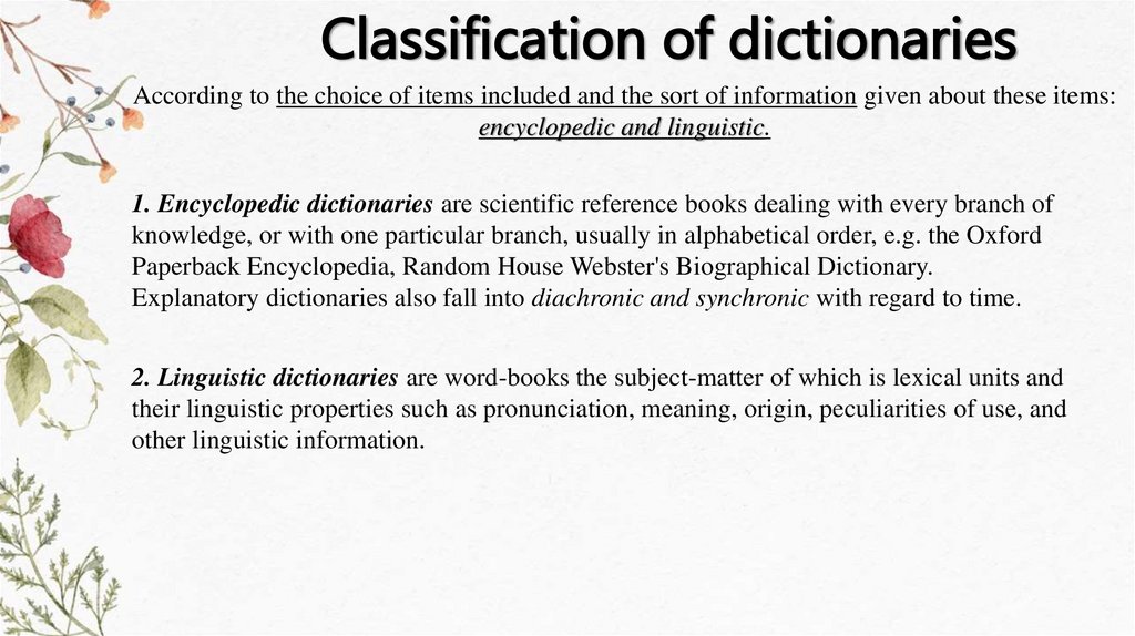 Classification of dictionariesAccording to the choice of items included and the sort of information given about these items: