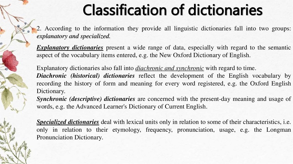 Explanatory dictionaries also fall into diachronic and synchronic with regard to time.