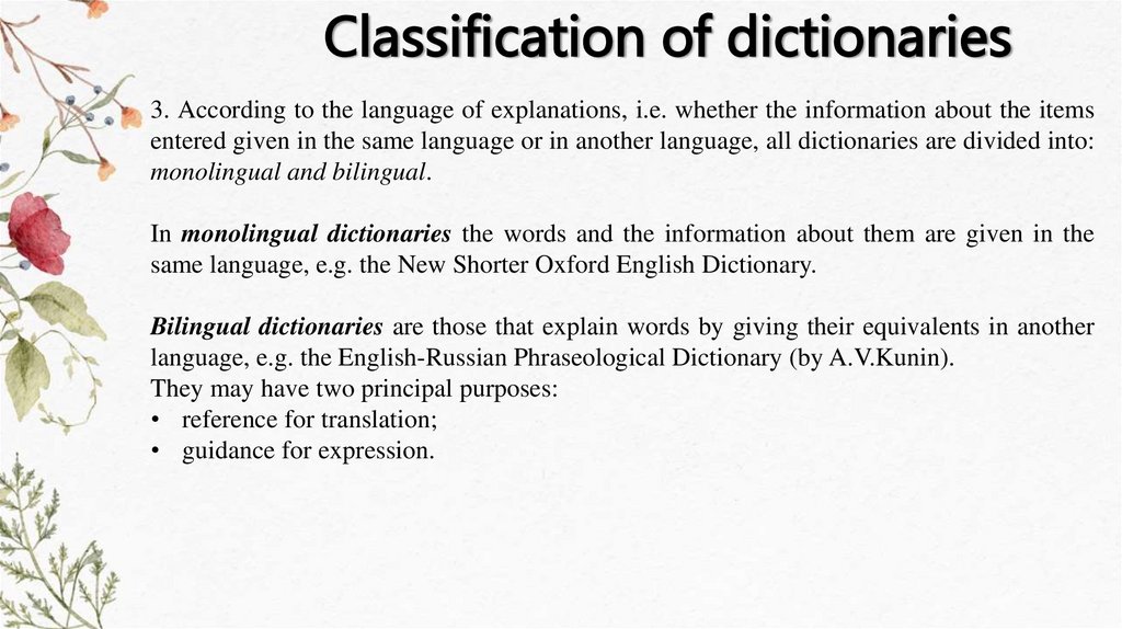 Classification of dictionaries3. According to the language of explanations, i.e. whether the information about the items