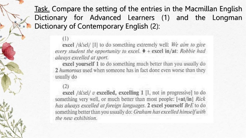 Task. Compare the setting of the entries in the Macmillan EnglishDictionary for Advanced Learners (1) and the Longman