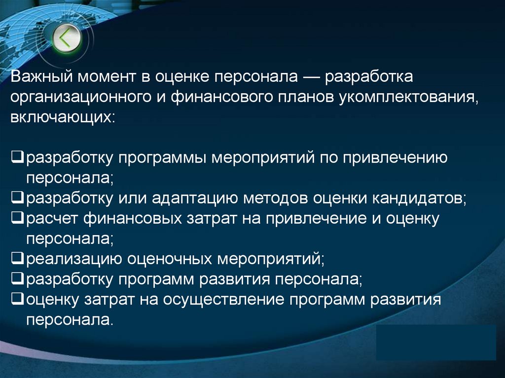 Важный момент в оценке персонала — разработкаорганизационного и финансового планов укомплектования,