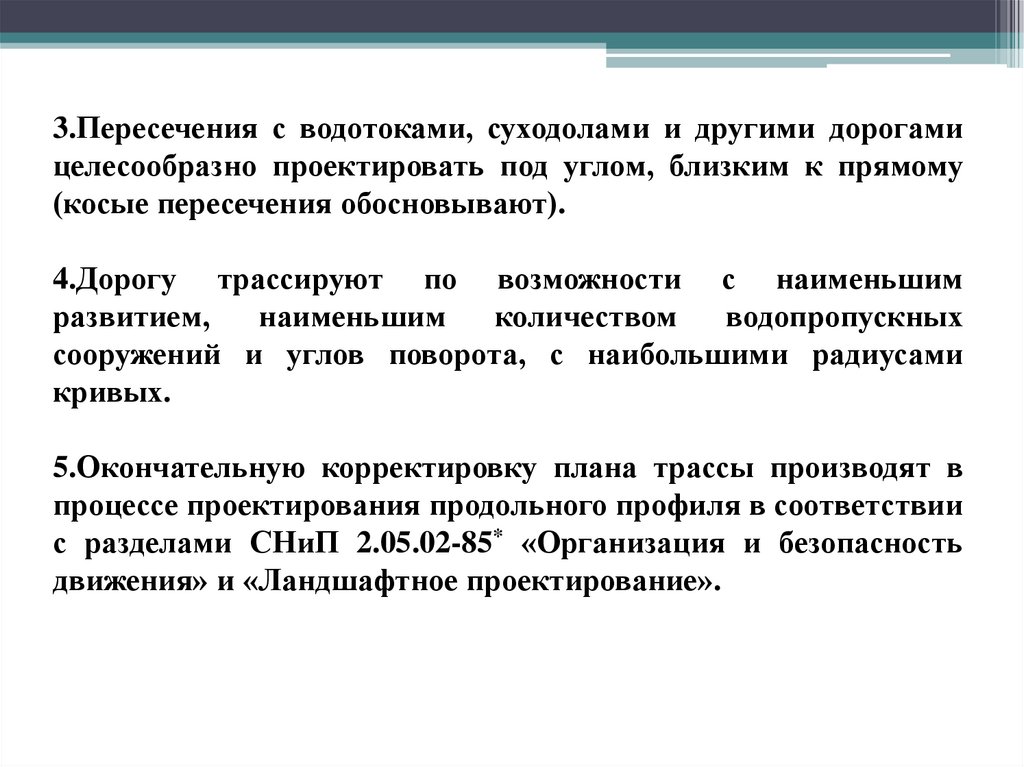 3.Пересечения с водотоками, суходолами и другими дорогамицелесообразно проектировать под углом, близким к прямому
