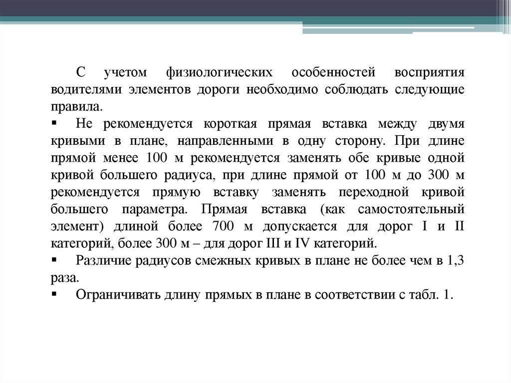 С учетом физиологических особенностей восприятияводителями элементов дороги необходимо соблюдать следующие