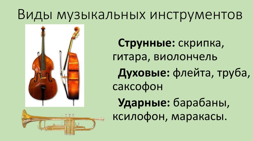 Виды музыкальных инструментовСтрунные: скрипка,