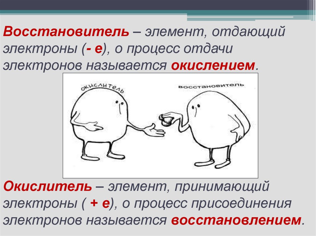 Восстановитель – элемент, отдающийэлектроны (- е), о процесс отдачи