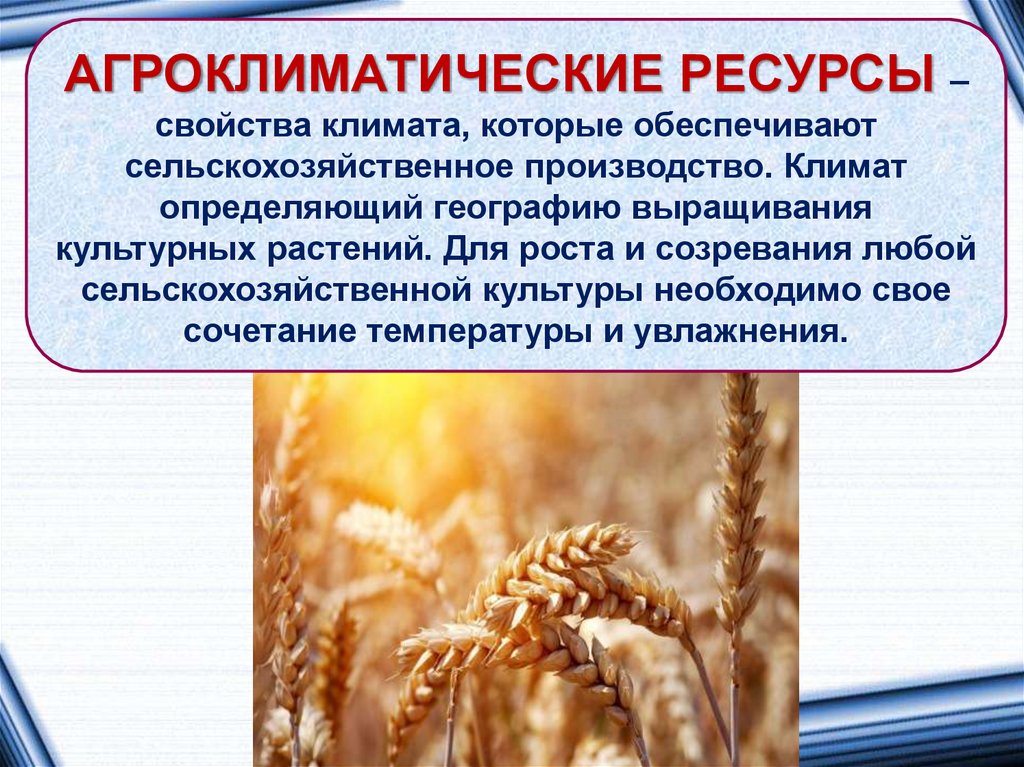 АГРОКЛИМАТИЧЕСКИЕ РЕСУРСЫ –свойства климата, которые обеспечивают