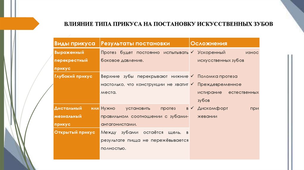 ВЛИЯНИЕ ТИПА ПРИКУСА НА ПОСТАНОВКУ ИСКУССТВЕННЫХ ЗУБОВВиды прикуса Результаты постановки