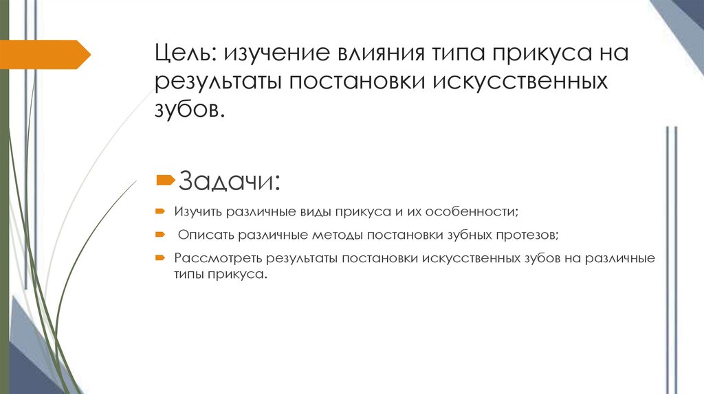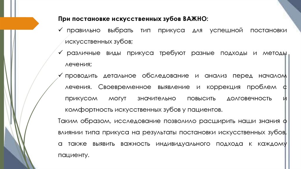 Цель: изучение влияния типа прикуса нарезультаты постановки искусственных