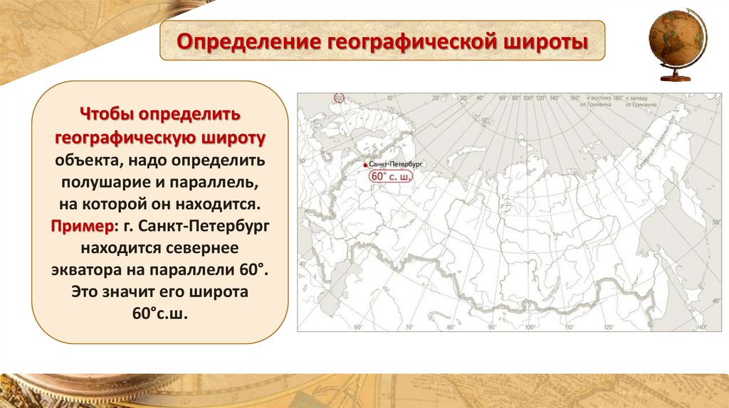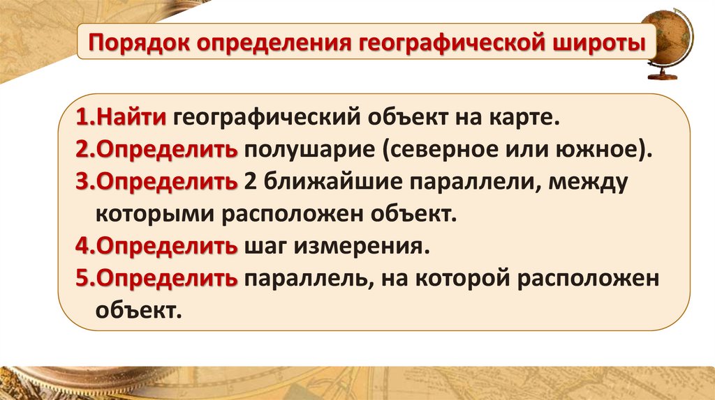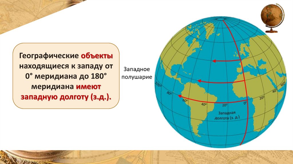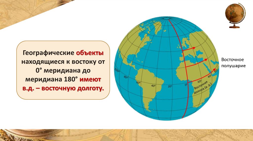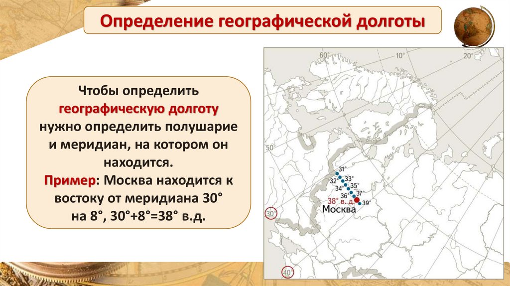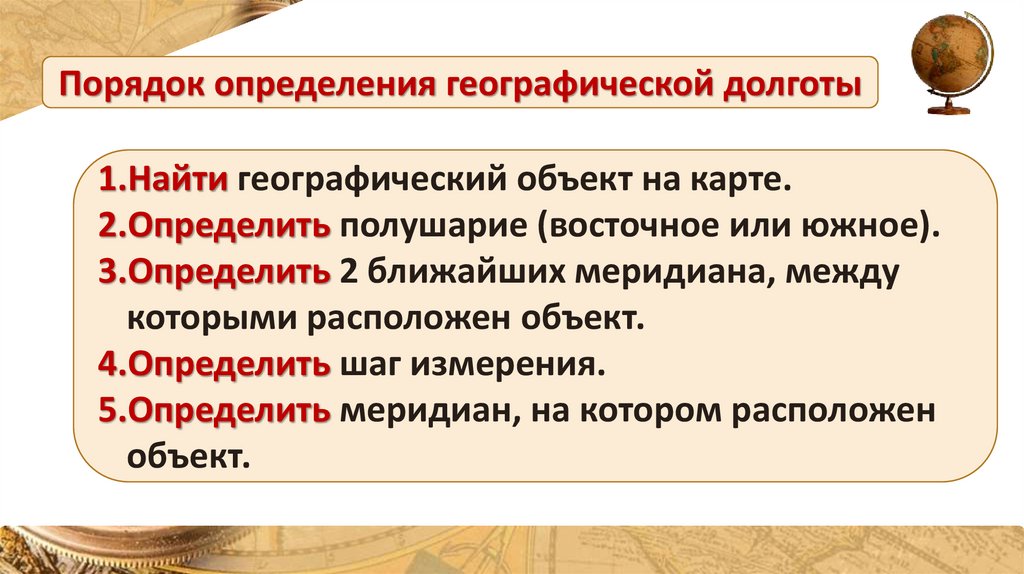 Порядок определения географической долготы1.Найти географический объект на карте.