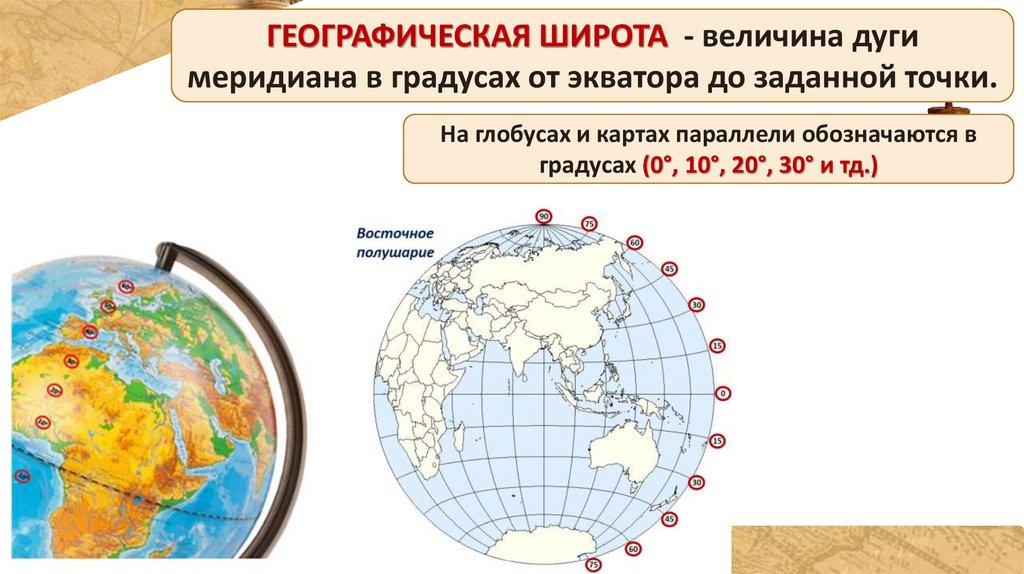 ГЕОГРАФИЧЕСКАЯ ШИРОТА - величина дугимеридиана в градусах от экватора до заданной точки.
