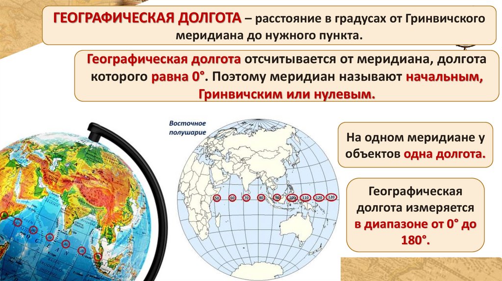 ГЕОГРАФИЧЕСКАЯ ДОЛГОТА – расстояние в градусах от Гринвичскогомеридиана до нужного пункта.