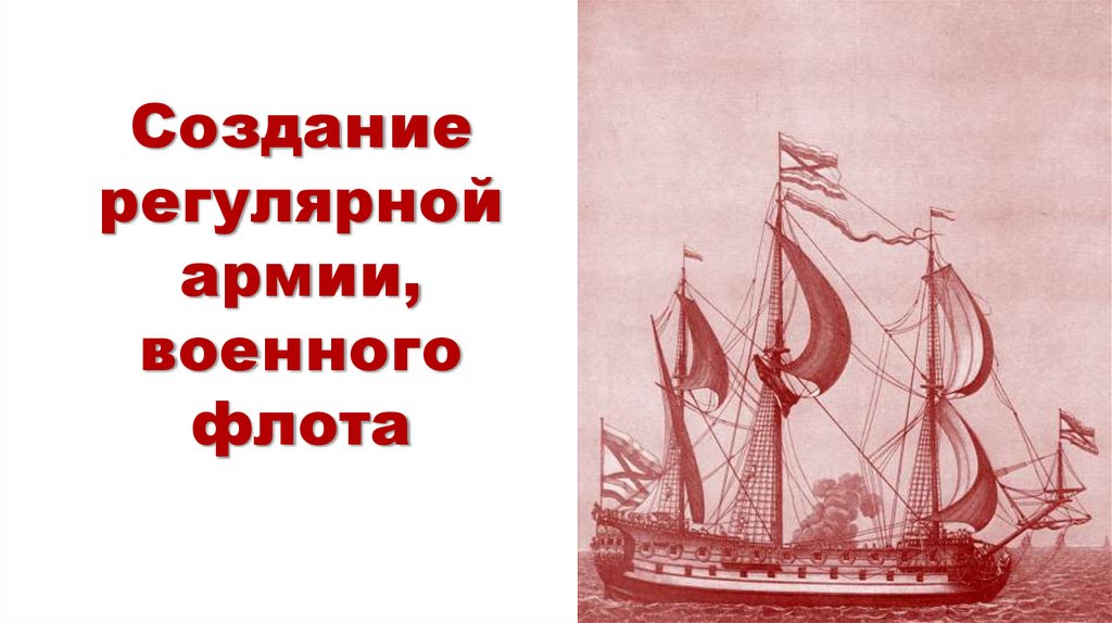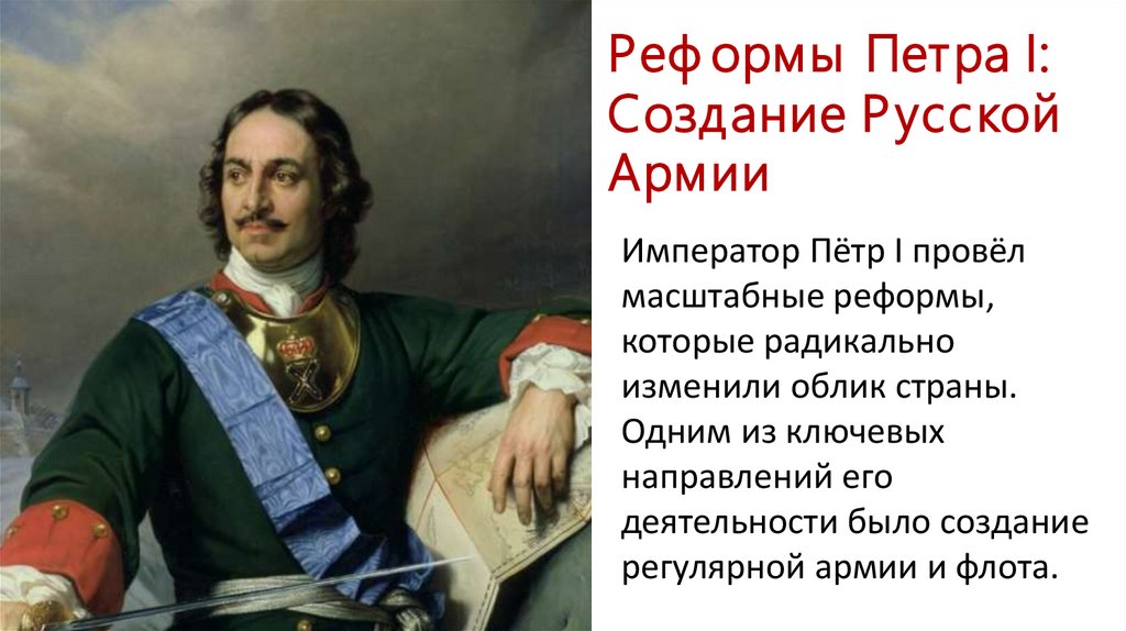 • Усилия Петра I привели к созданию мощной армии и флота,