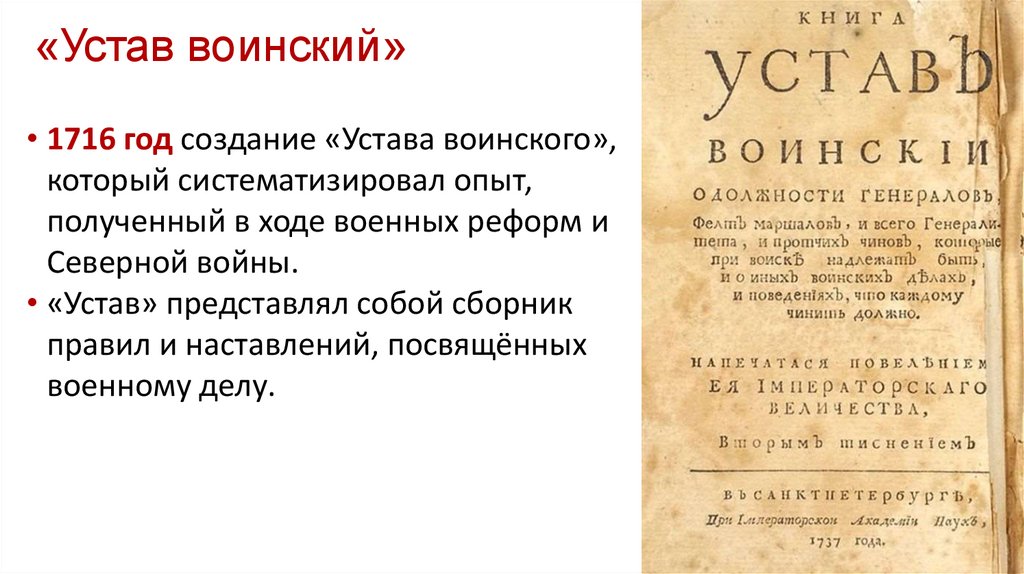«Устав воинский»• 1716 год создание «Устава воинского»,
