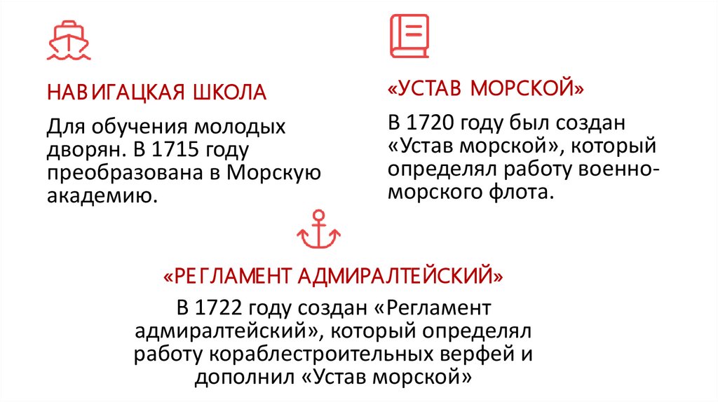 • Особое внимание Пётр I уделял строительству военного флота, что