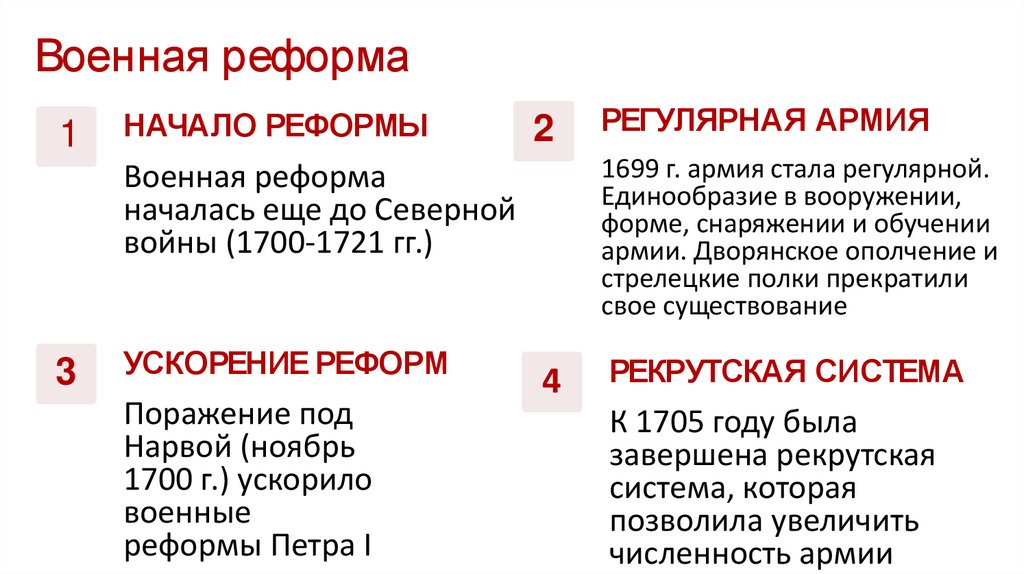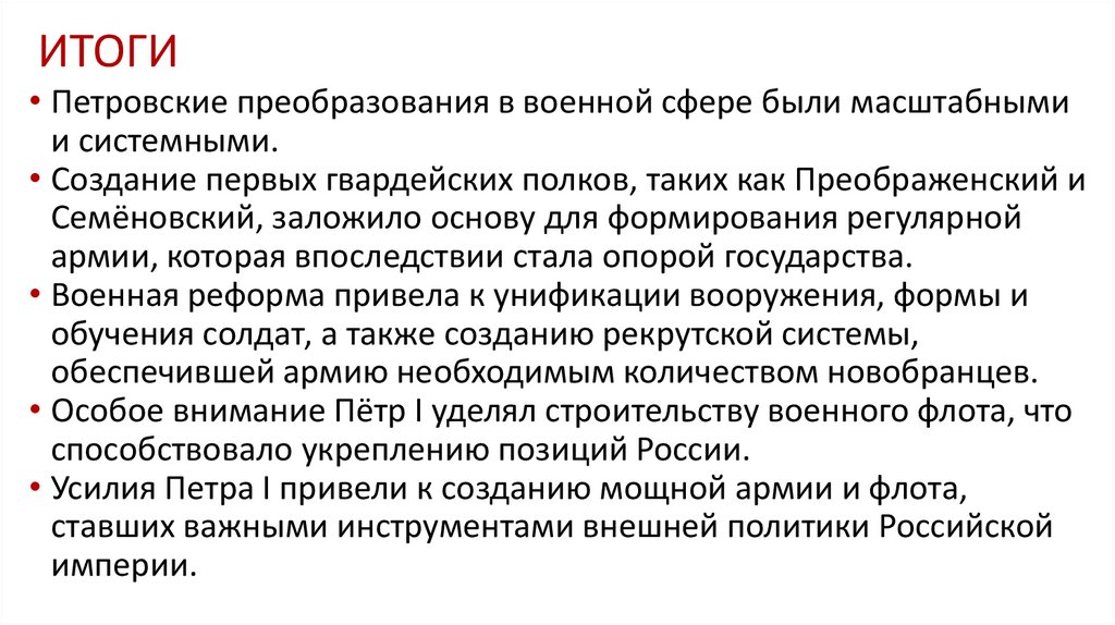 ИТОГИ• Петровские преобразования в военной сфере были масштабными