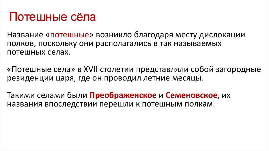 Потешные сёлаНазвание «потешные» возникло благодаря месту дислокации