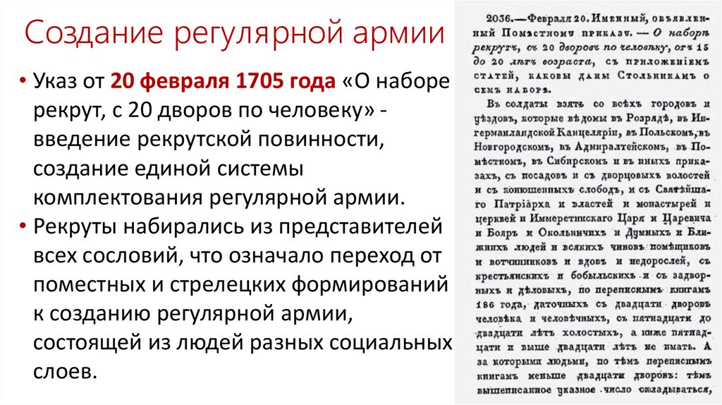 Создание регулярной армии• Указ от 20 февраля 1705 года «О наборе