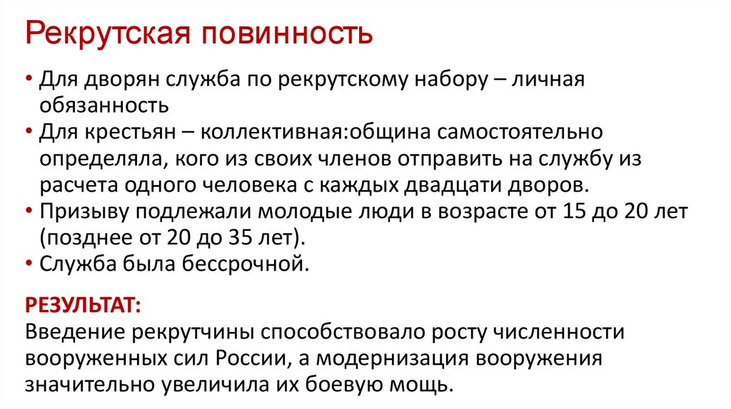 рекрут, с 20 дворов по человеку» введение рекрутской повинности,