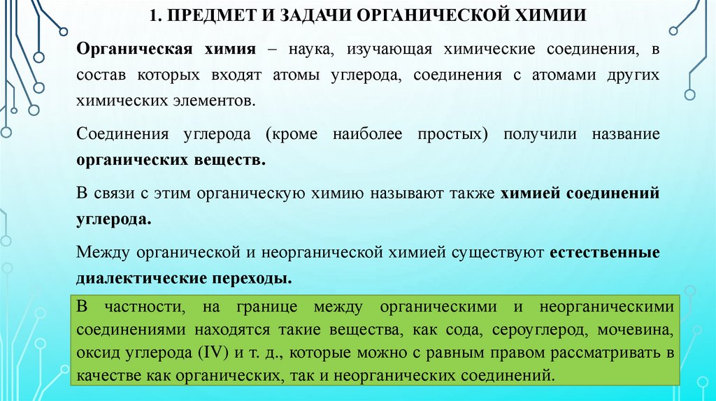 1. ПРЕДМЕТ И ЗАДАЧИ ОРГАНИЧЕСКОЙ ХИМИИОрганическая химия – наука, изучающая химические соединения, в