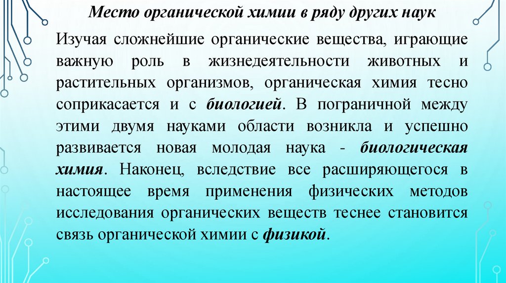 Место органической химии в ряду других наукИзучая сложнейшие органические вещества, играющие