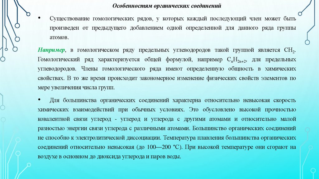 Особенностям органических соединенийСуществование гомологических рядов, у которых каждый последующий член может быть