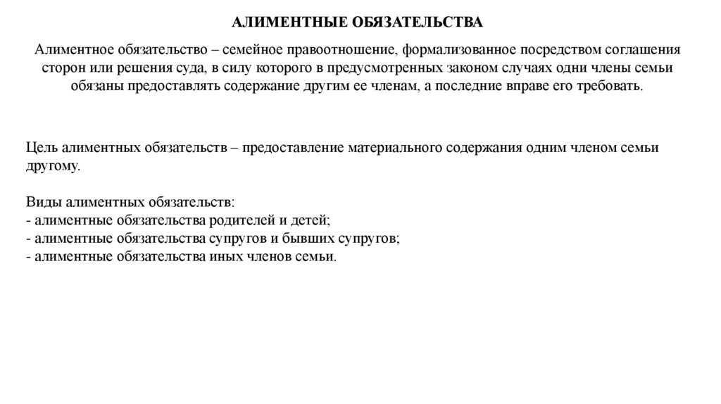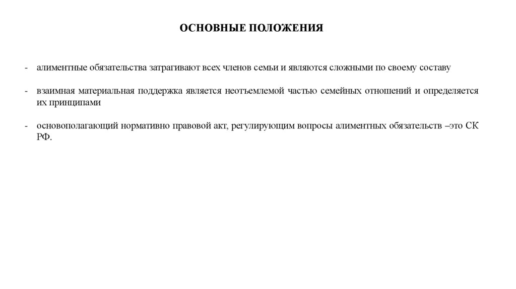 ОСНОВНЫЕ ПОЛОЖЕНИЯ- алиментные обязательства затрагивают всех членов семьи и являются сложными по своему составу