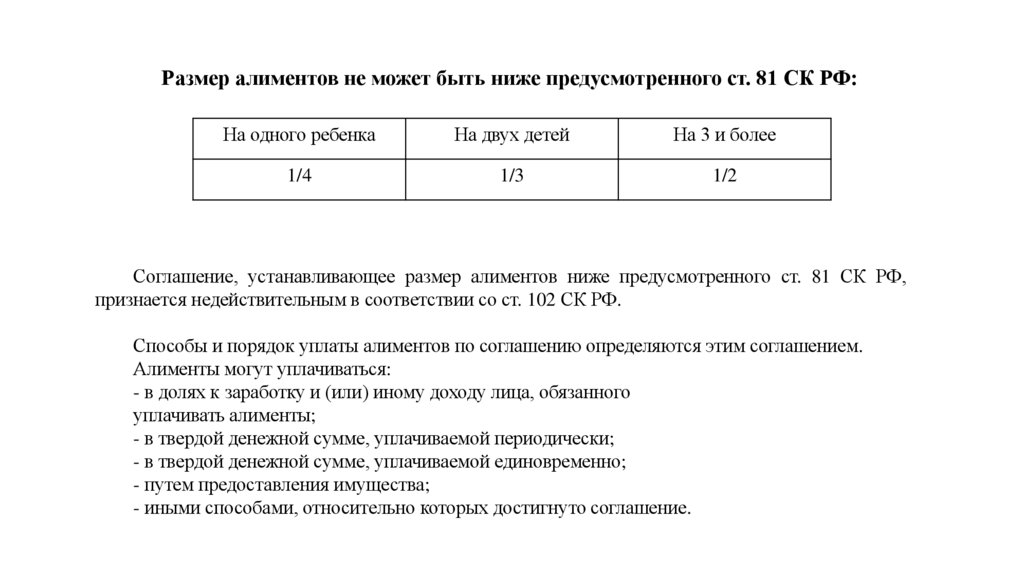 Размер алиментов не может быть ниже предусмотренного ст. 81 СК РФ:На одного ребенка