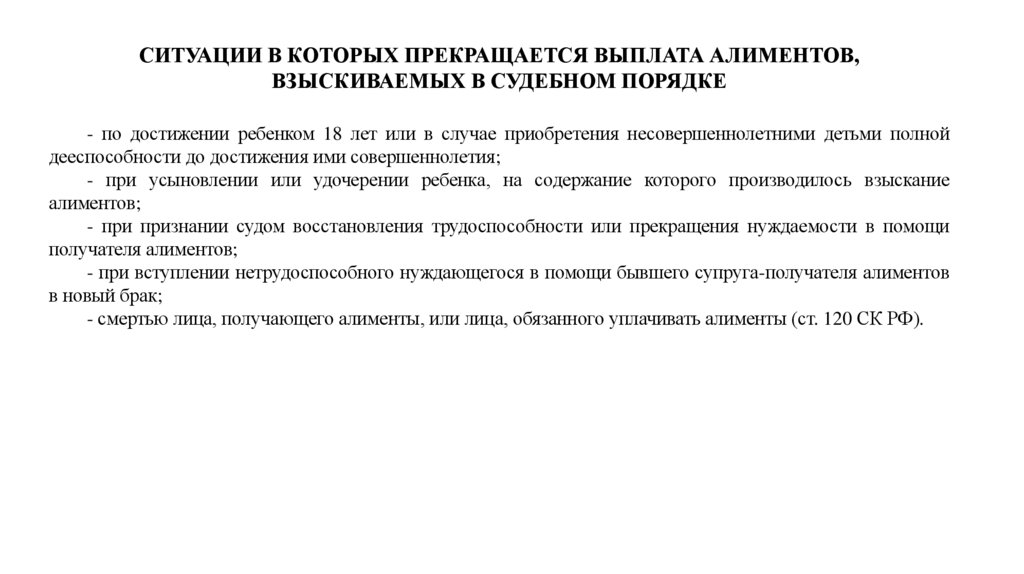 СИТУАЦИИ В КОТОРЫХ ПРЕКРАЩАЕТСЯ ВЫПЛАТА АЛИМЕНТОВ,ВЗЫСКИВАЕМЫХ В СУДЕБНОМ ПОРЯДКЕ