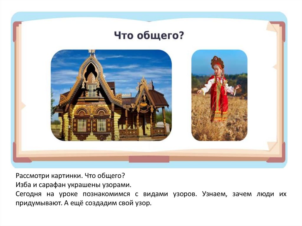 Рассмотри картинки. Что общего?Изба и сарафан украшены узорами.