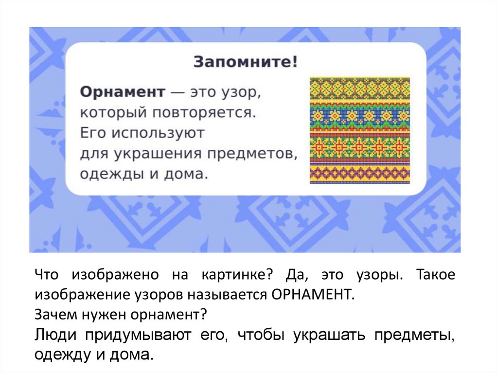 Сегодня на уроке познакомимся с видами узоров. Узнаем, зачем люди их