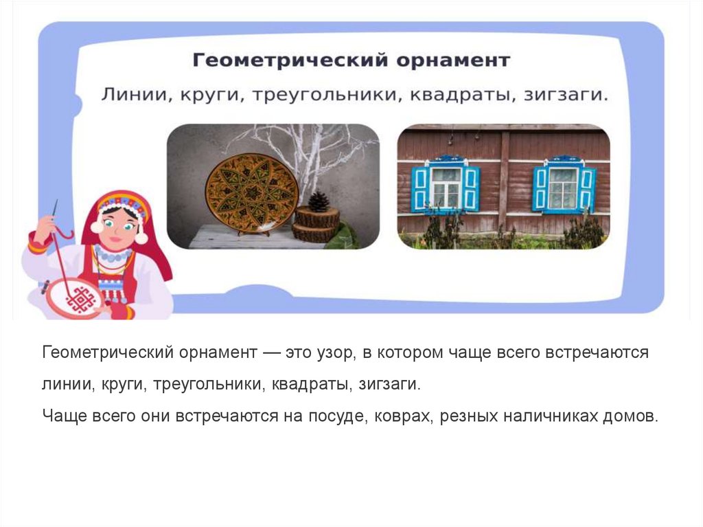 Геометрический орнамент — это узор, в котором чаще всего встречаютсялинии, круги, треугольники, квадраты, зигзаги.