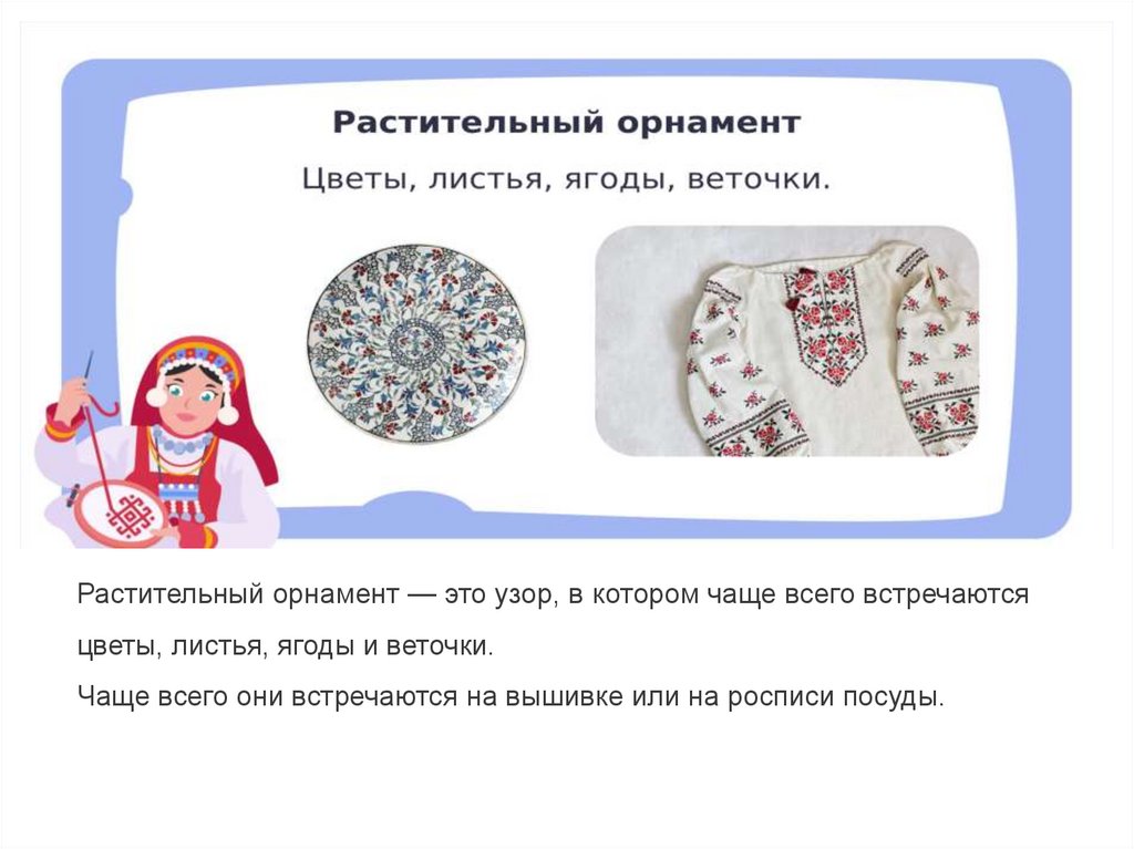 Растительный орнамент — это узор, в котором чаще всего встречаютсяцветы, листья, ягоды и веточки.
