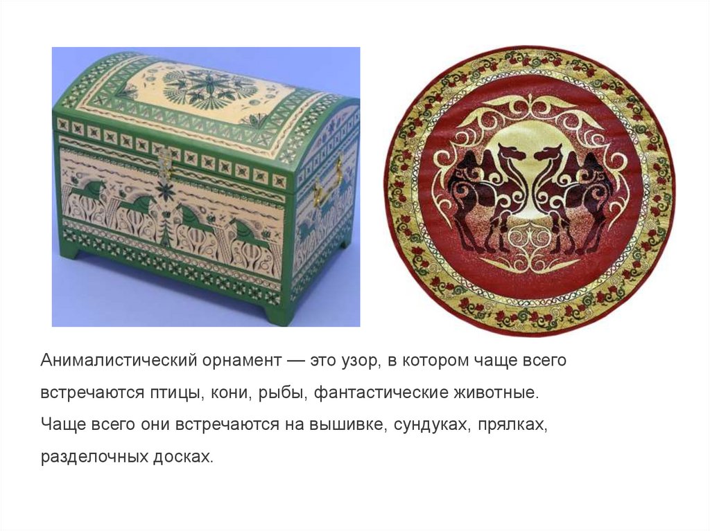 Анималистический орнамент — это узор, в котором чаще всеговстречаются птицы, кони, рыбы, фантастические животные.