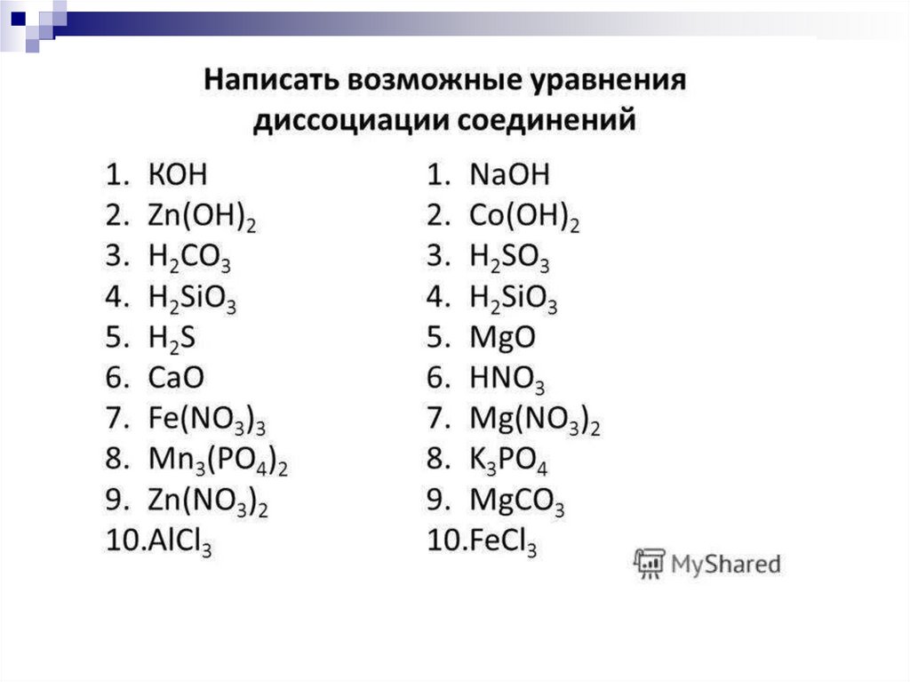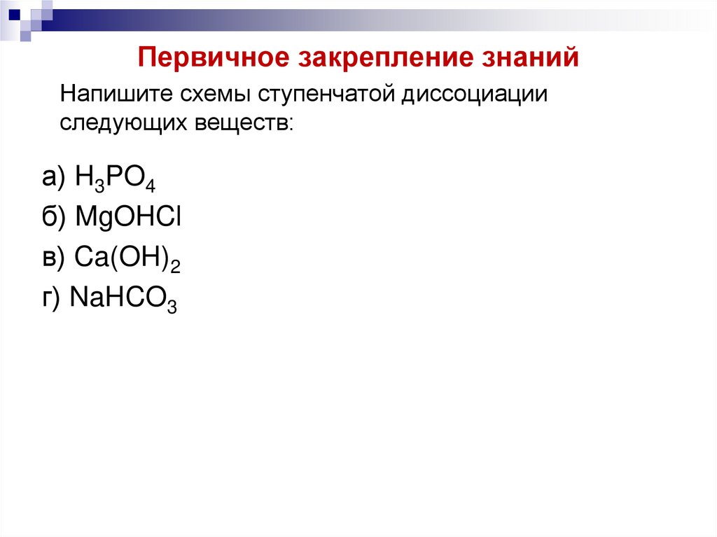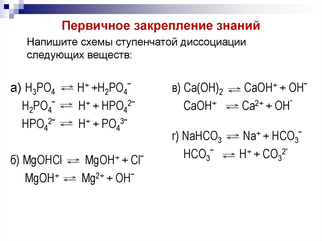 Первичное закрепление знанийНапишите схемы ступенчатой диссоциации