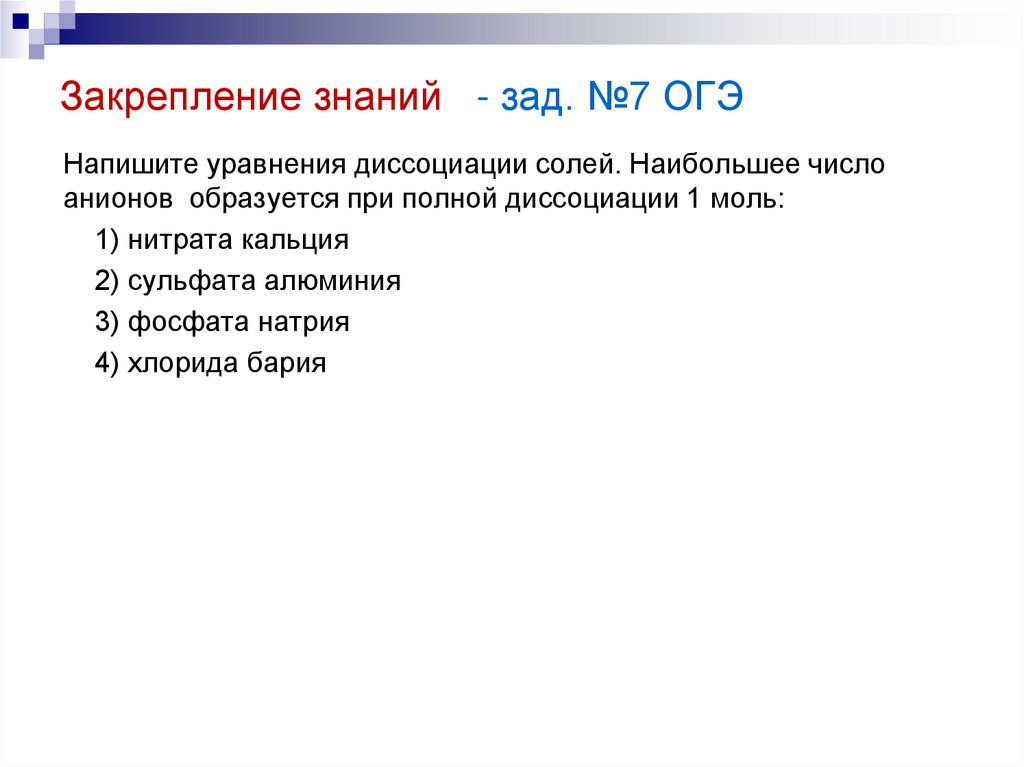 Закрепление знаний - зад. №7 ОГЭНапишите уравнения диссоциации солей. Наибольшее число
