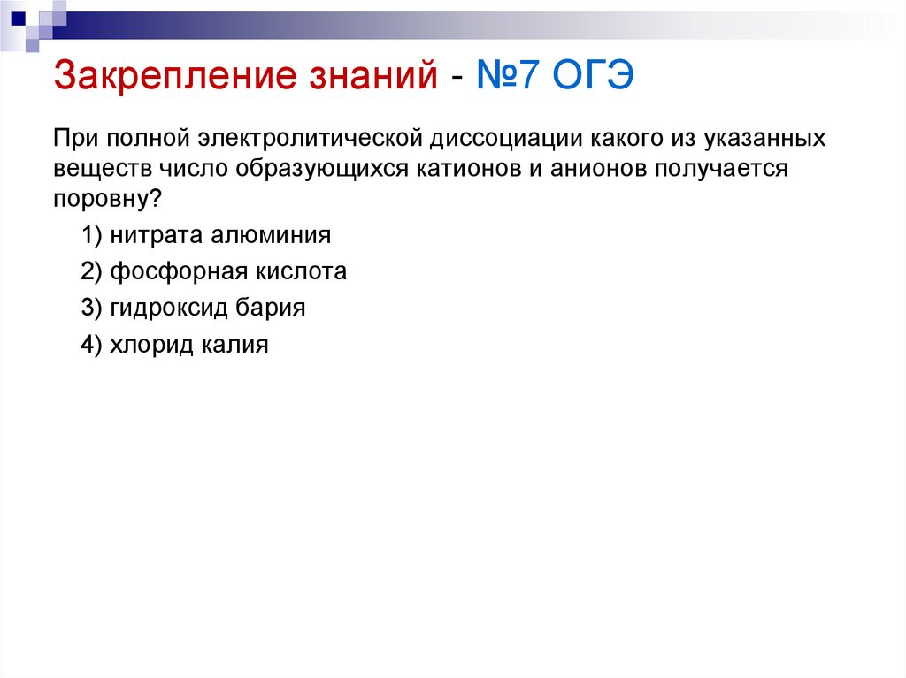 Закрепление знаний - №7 ОГЭПри полной электролитической диссоциации какого из указанных