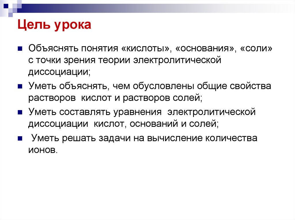 Цель урокаОбъяснять понятия «кислоты», «основания», «соли»