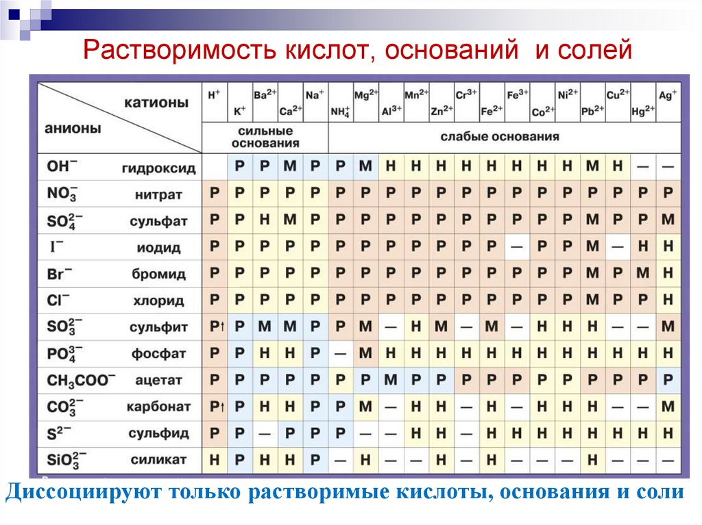 Растворимость кислот, оснований и солейДиссоциируют только растворимые кислоты, основания и соли