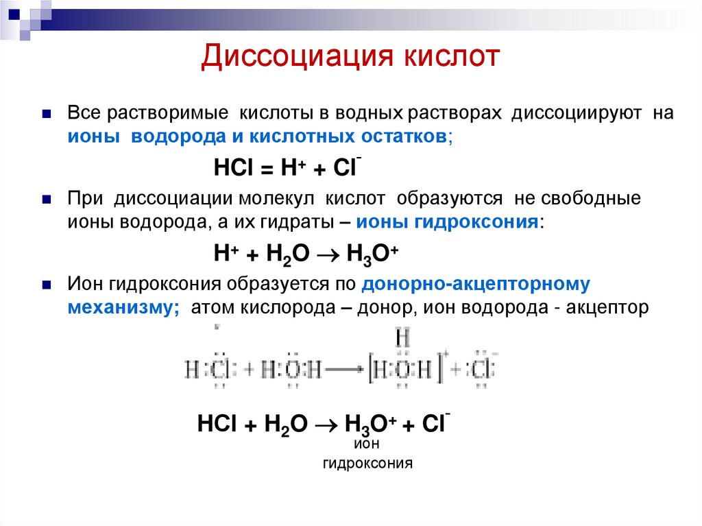 Диссоциация кислотВсе растворимые кислоты в водных растворах диссоциируют на