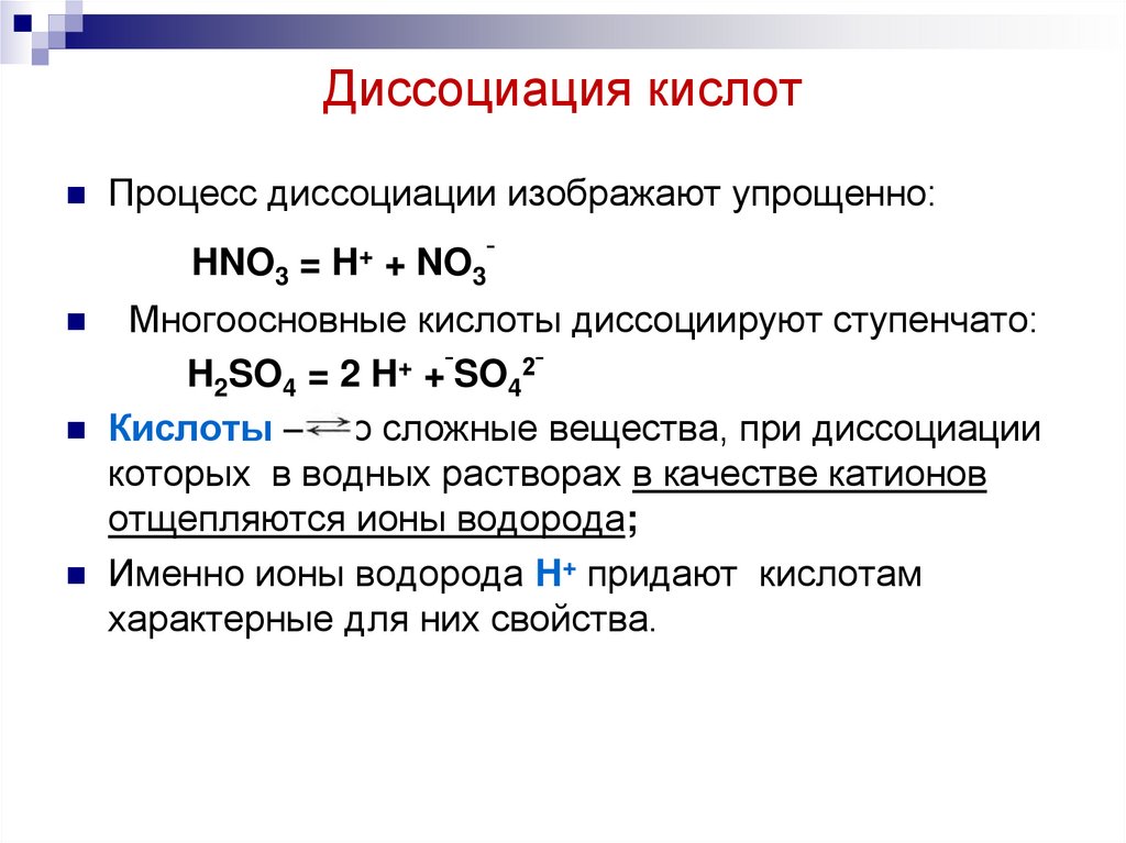 Диссоциация кислотПроцесс диссоциации изображают упрощенно:
