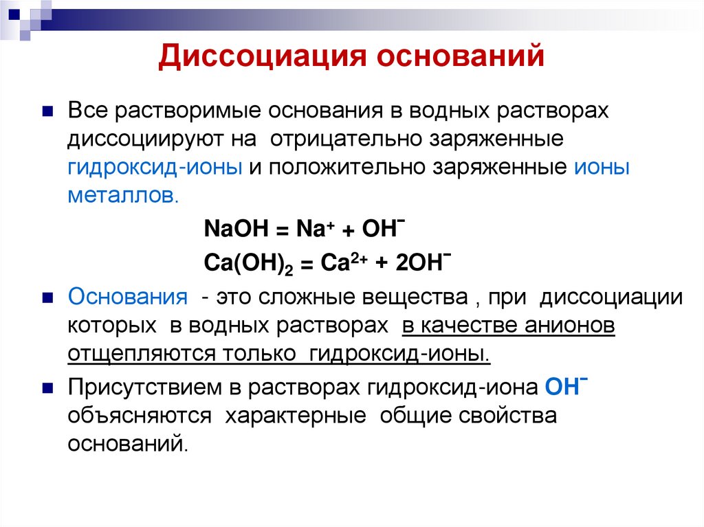 Диссоциация основанийВсе растворимые основания в водных растворах
