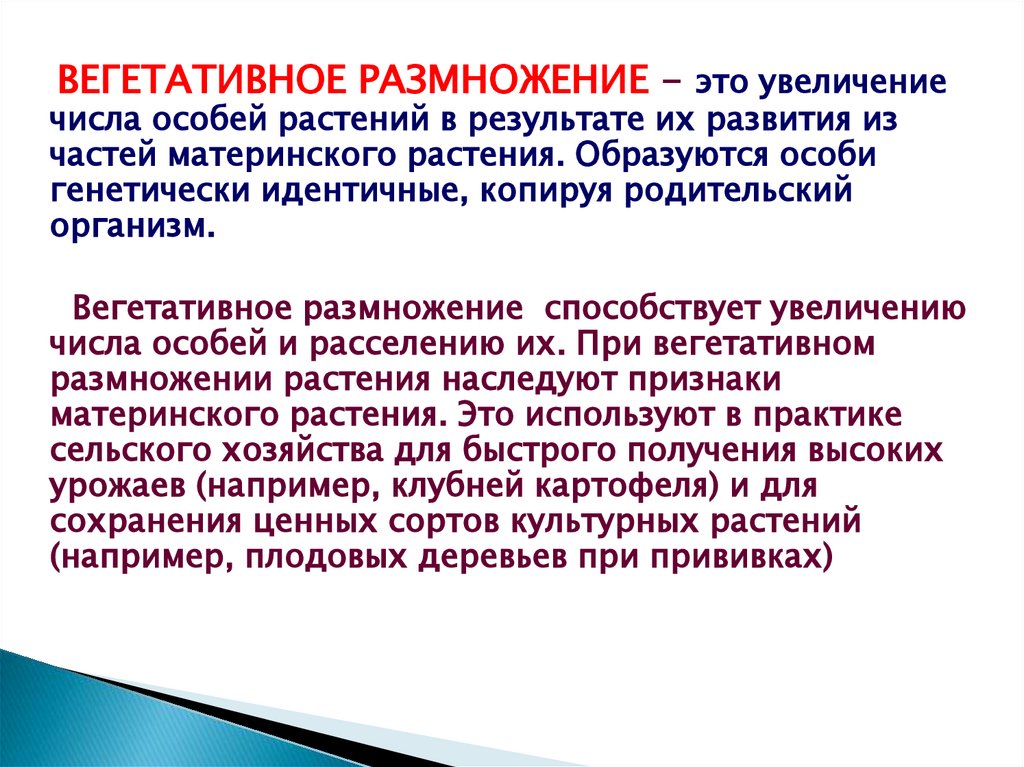 ВЕГЕТАТИВНОЕ РАЗМНОЖЕНИЕ - это увеличениечисла особей растений в результате их развития из
