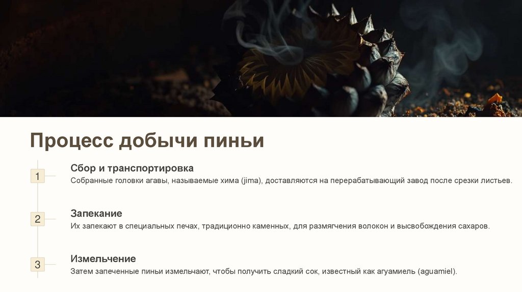 Схема включает: сбор агавы -> запекание пиньи -> измельчение -> ферментация сусла -> дистилляция -> выдержка