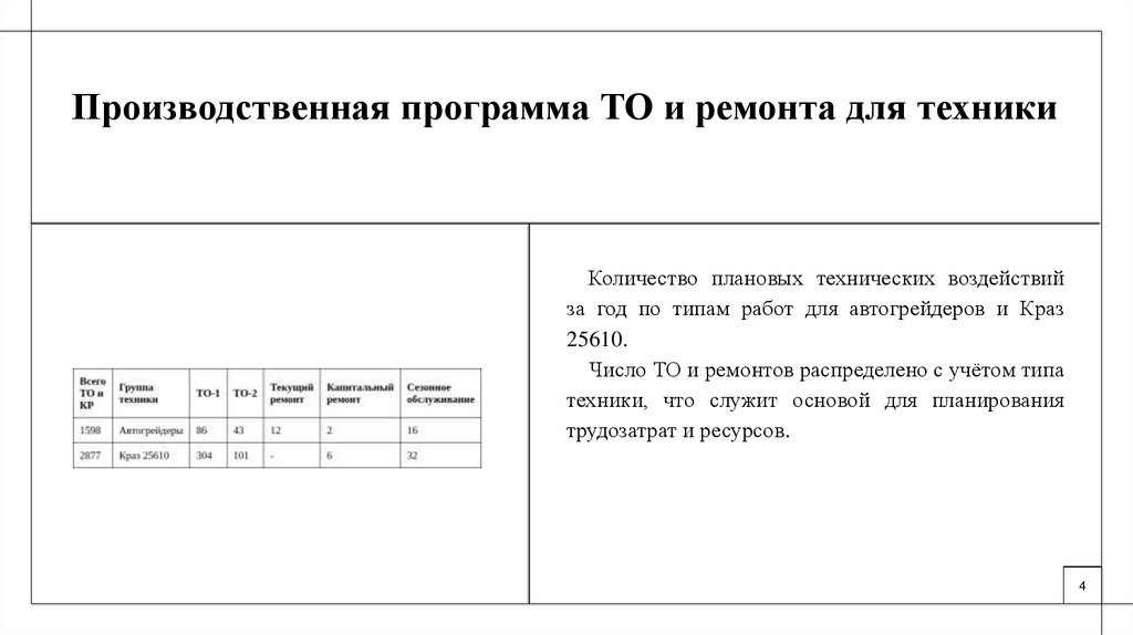 Производственная программа ТО и ремонта для техникиКоличество плановых технических воздействий