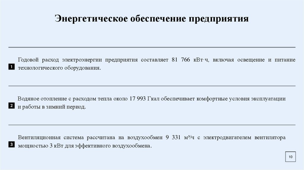 Энергетическое обеспечение предприятияГодовой расход электроэнергии предприятия составляет 81 766 кВт·ч, включая освещение и питание