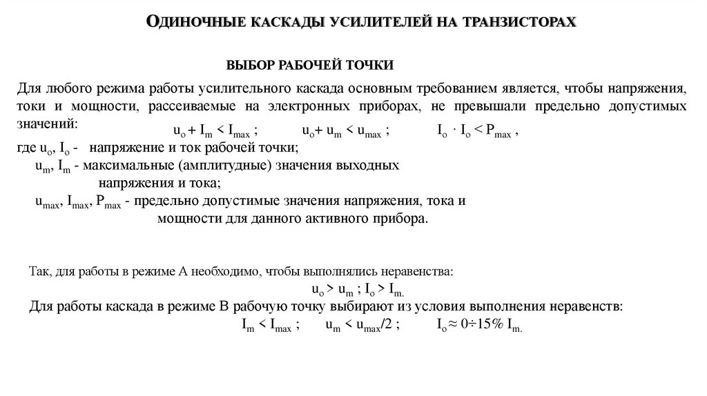 ОДИНОЧНЫЕ КАСКАДЫ УСИЛИТЕЛЕЙ НА ТРАНЗИСТОРАХВЫБОР РАБОЧЕЙ ТОЧКИ