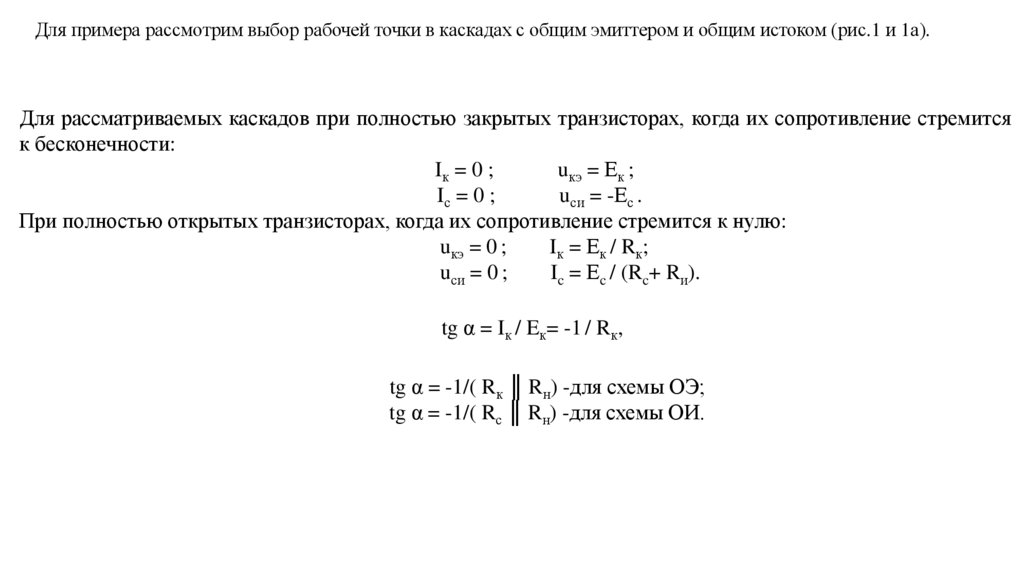 Для примера рассмотрим выбор рабочей точки в каскадах с общим эмиттером и общим истоком (рис.1 и 1а).Для рассматриваемых каскадов при полностью закрытых транзисторах, когда их сопротивление стремится