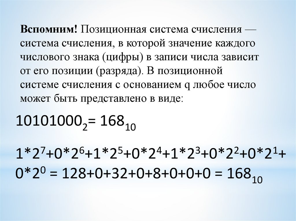 Вспомним! Позиционная система счисления —система счисления, в которой значение каждого