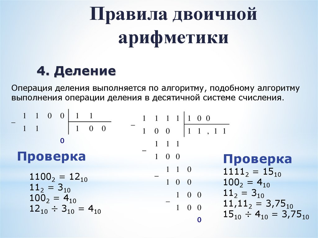 Операция деления выполняется по алгоритму, подобному алгоритму