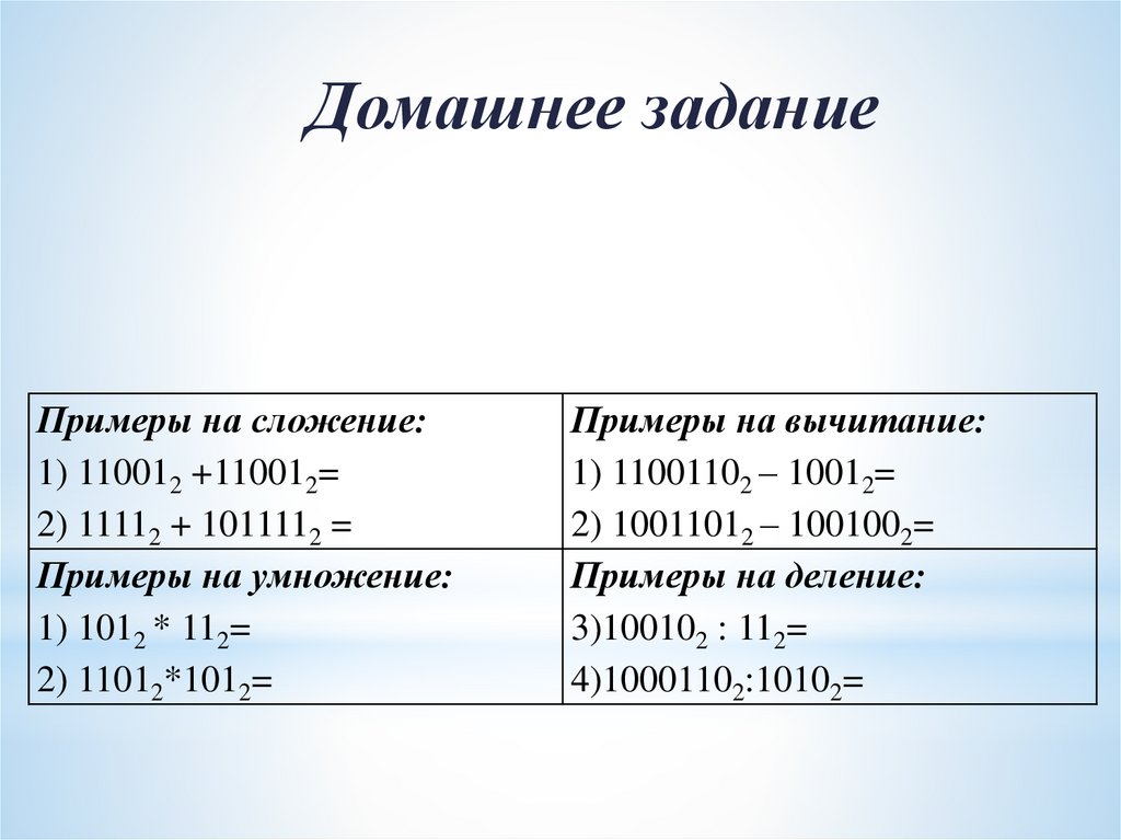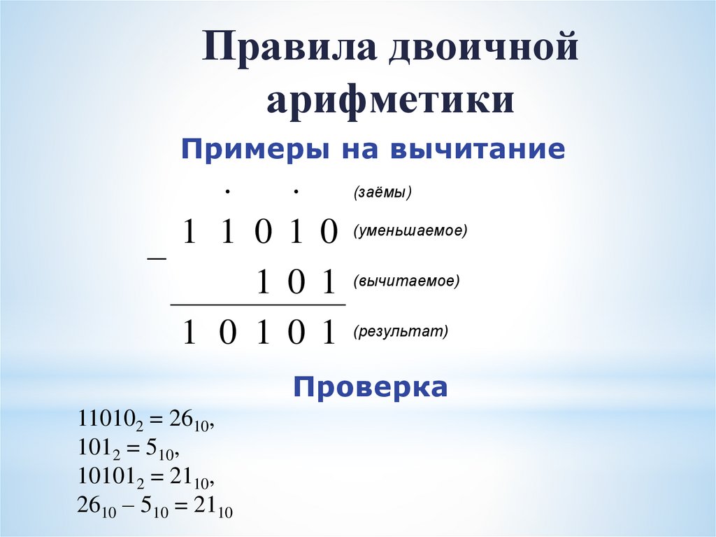 Решение. При вычитании двоичных чисел, как и в десятичной системе счисления, требуется